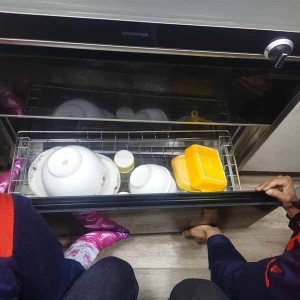 圖六:兩位服務(wù)小哥正在對消毒柜進(jìn)行清潔,裝的的碗有點多,他們清理的時候辛苦了。