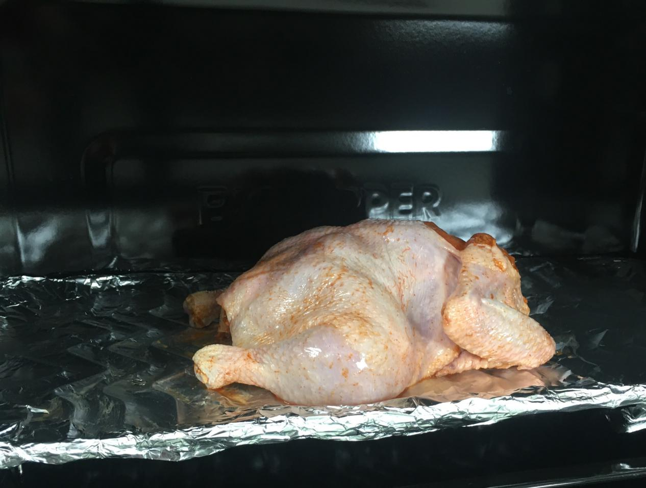 5. 打開北斗星蒸烤一體集成灶,選擇烤,調(diào)至濕烤模式,165度55分鐘,預(yù)熱后把雞放入,雞胸朝下即可;