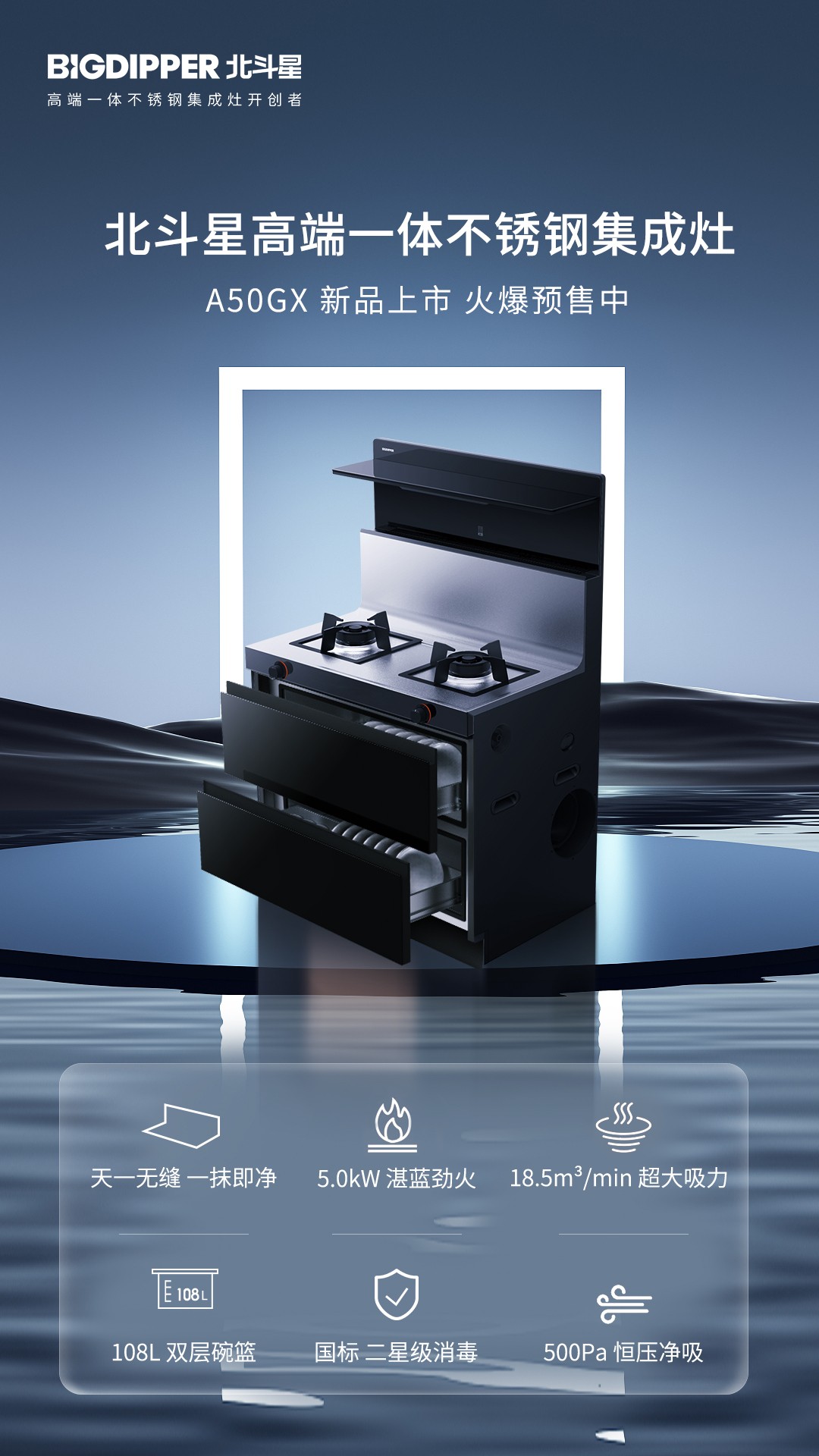 高端一體不銹鋼集成灶搭配水槽洗碗機,額外加贈燃氣熱水器一臺,輕松滿足一家人的日常烹飪所需。心動不如行動!入手北斗星,感受不一樣的廚房體驗!